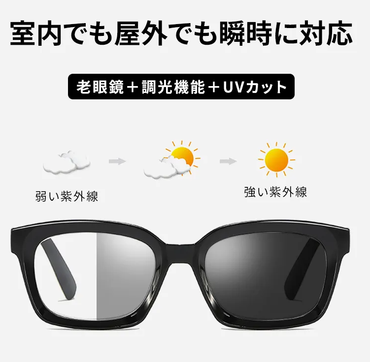 「掛け外しが面倒」という声にお応えして、室内ではクリア、屋外ではサングラスに変化する**「調光レンズ」**と相性抜群のフレームを選出しました。どんなファッションにも馴染むシンプルでモダンなデザインなら、朝から夜までこの一本で過ごせます。紫外線対策もバッチリです。