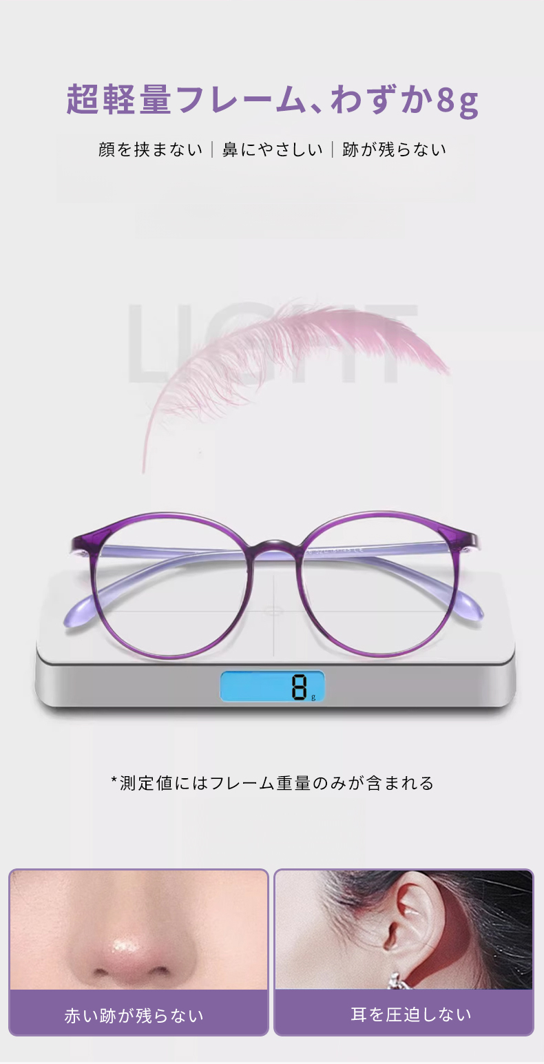 【8g超軽量・二重焦点対応】Eterlens|TR素材「Airy Purple」|肌映え半透明ボストン型|締め付けゼロ 超軽量|単焦点・ブルーライトカット|大人の素顔を上品に彩る