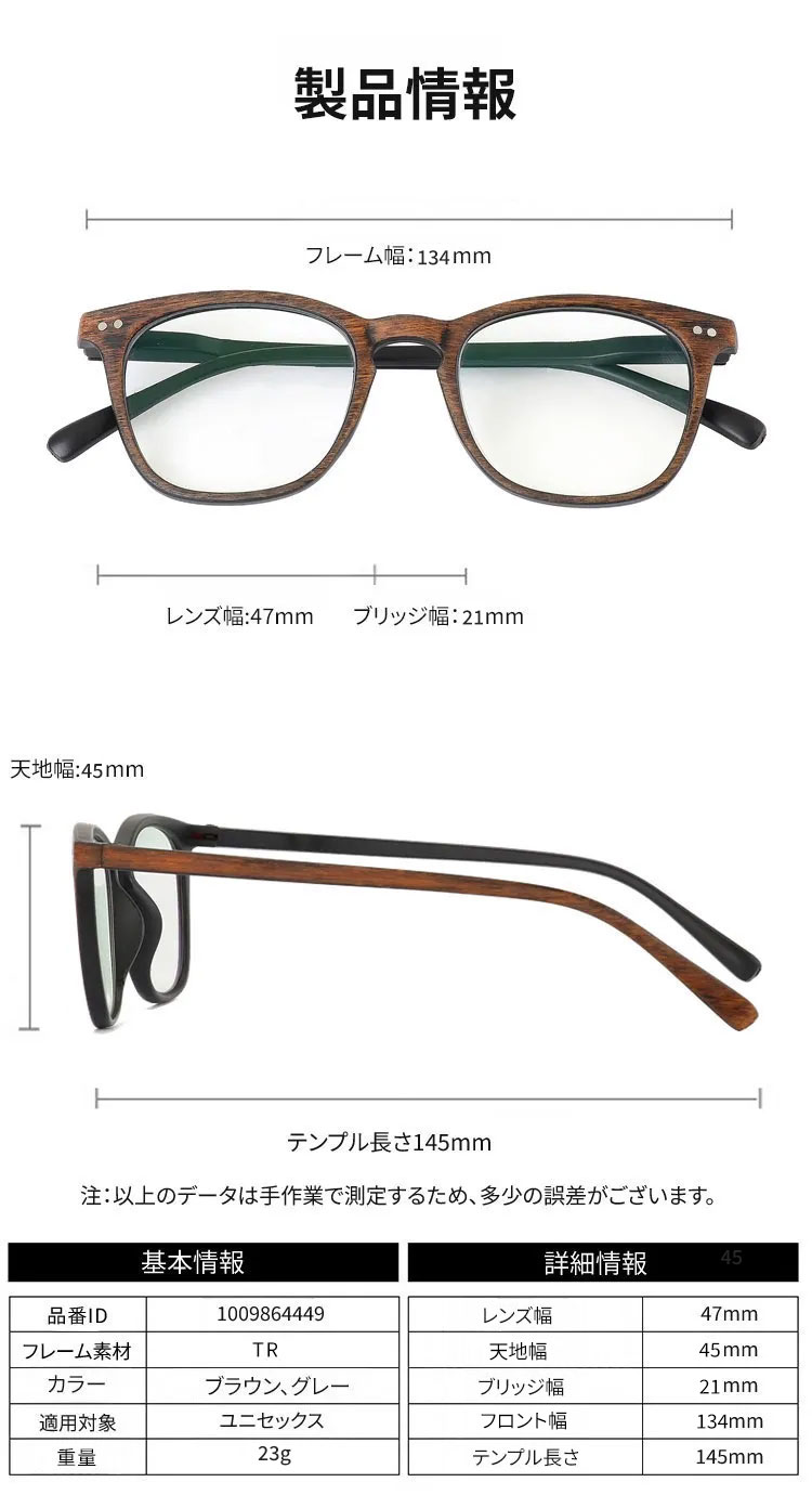 クラシックな木目調デザインとスクエアシルエットが融合した、温かみと洗練さを兼ね備えたデザイン。自然な質感が顔まわりに柔らかさを与え、落ち着いた印象を演出します。ユニセックス仕様で幅広いスタイルにマッチします。