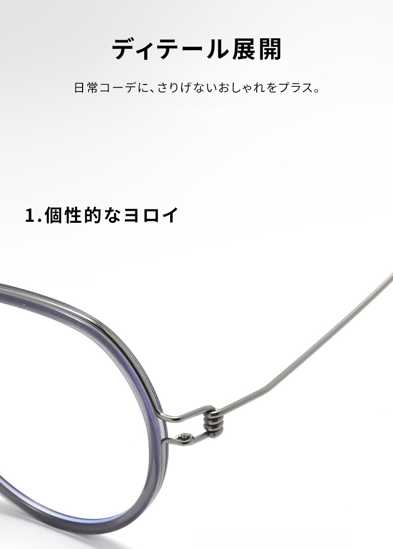 フロントに軽量素材、テンプルにしなやかで強度の高いチタンを組み合わせたハーフチタン構造を採用。ネジなし設計により安定性が高く、快適な掛け心地を実現し、度付きレンズにも対応しています。