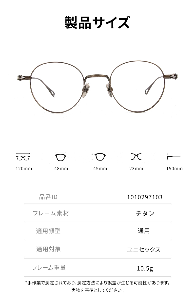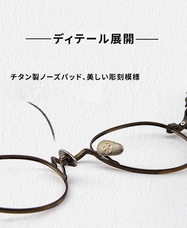 メガネはチタン素材を採用し、軽さと丈夫さを両立。 クリアレンズとシリコンノーズパッドが快適な掛け心地をサポートし、長時間の着用にも適しています。 度付きレンズにも対応可能です。