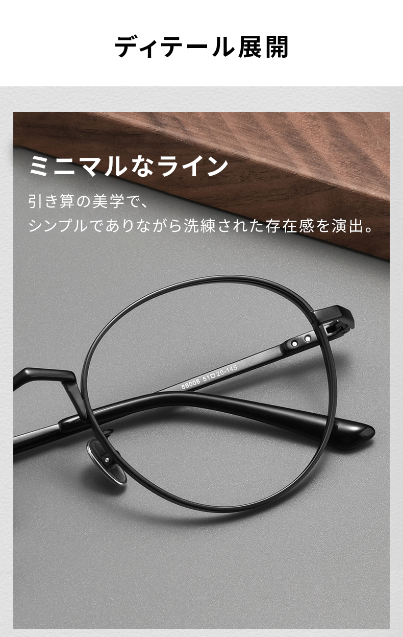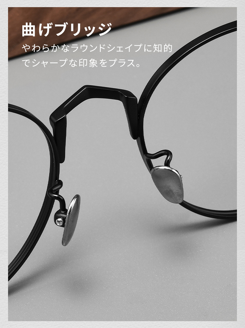 クラシカルなラウンドフレームに、クラシックなディテールにモダンなエッセンスを加えたデザインは、ビジネスシーンにもカジュアルシーンにも自然に馴染みます。無駄のないシルエットが知性と余裕を感じさせ、日常に静かなラグジュアリーを添えます。
