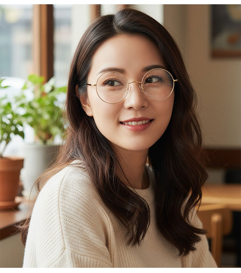 シンプルで主張しすぎないラウンド型は、ビジネスにもカジュアルにも合わせやすく、顔周りを柔らかく見せる万能デザインです。