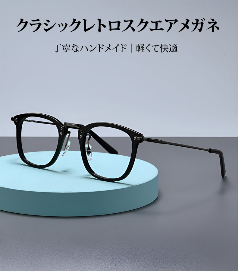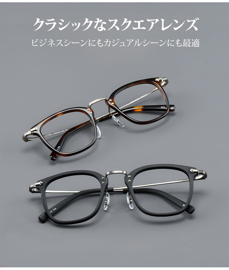 落ち着いたブラックフレームがどんなスタイルにも合わせやすく、ビジネスから日常まで自然に馴染む万能なスクエアタイプです。