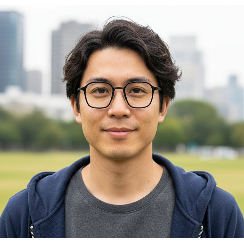細身スクエアフレームは顔まわりをすっきり見せ、小顔効果も期待できます。モノトーンやビジネススタイルはもちろん、シンプルコーデにも合わせやすい万能フレームです。