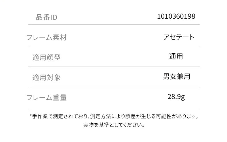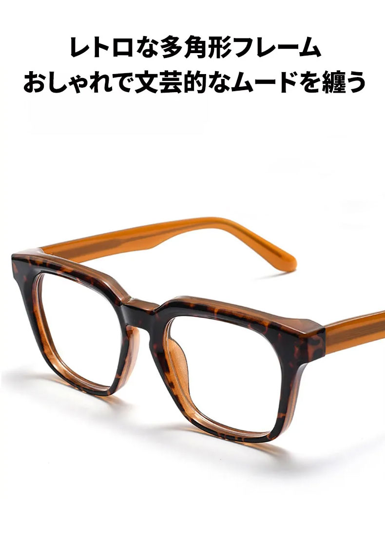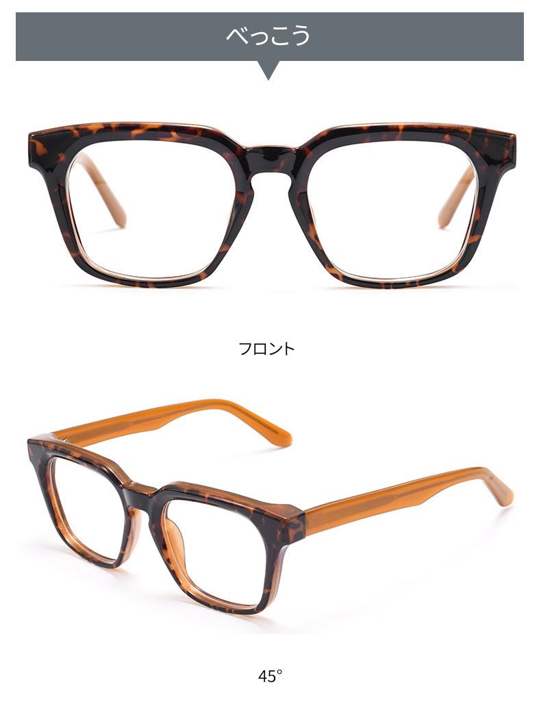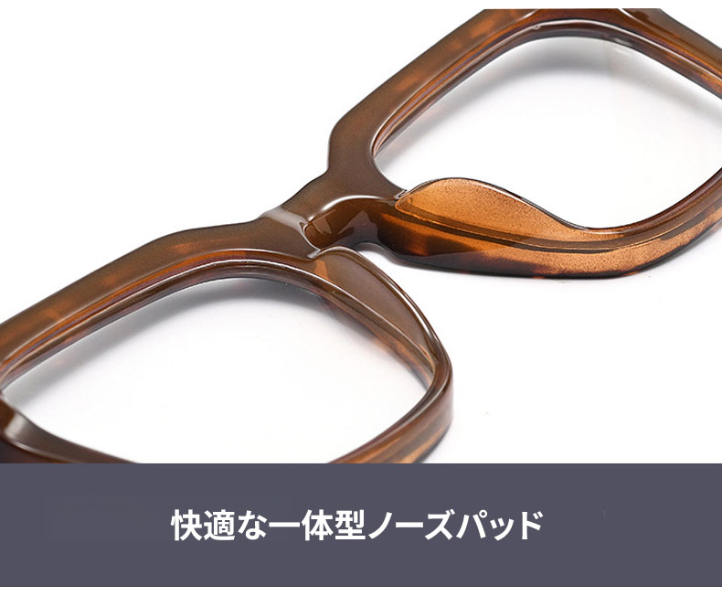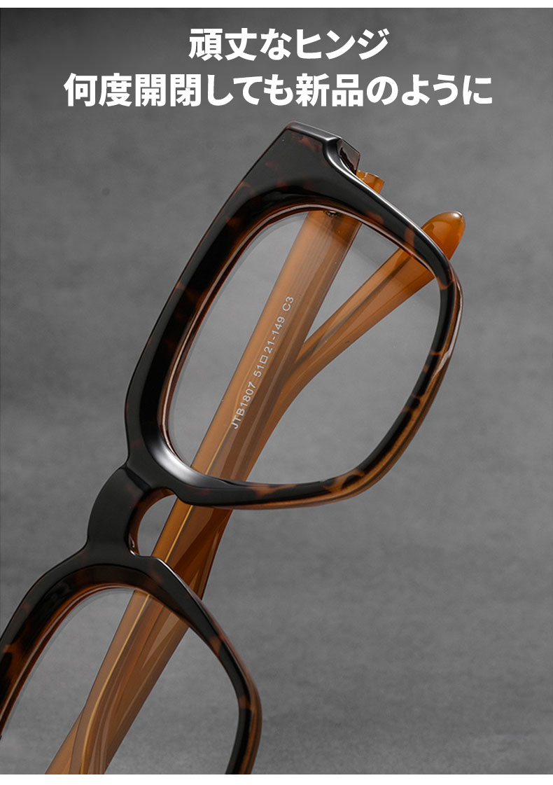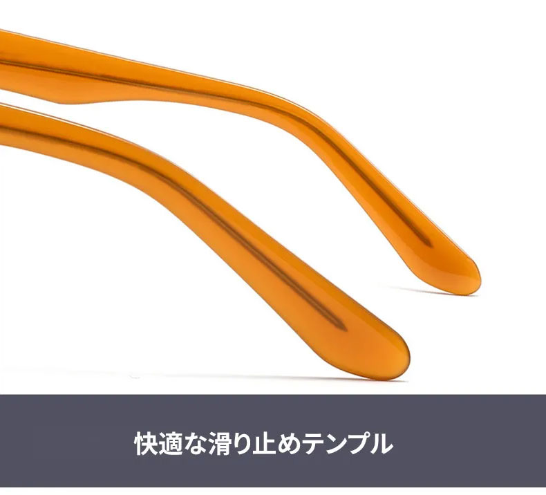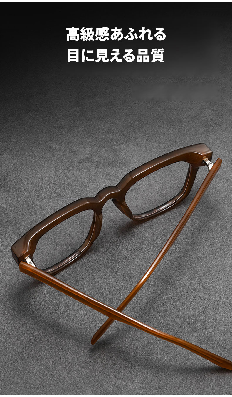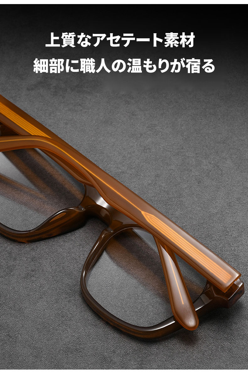 アセテート素材を使用し、しっとりとした手触りと滑らかな光沢が特徴です。型崩れしにくく、掛け心地も安定しているため、長時間の使用にぴったりです。度付きレンズにも対応し、日常使いに便利です。