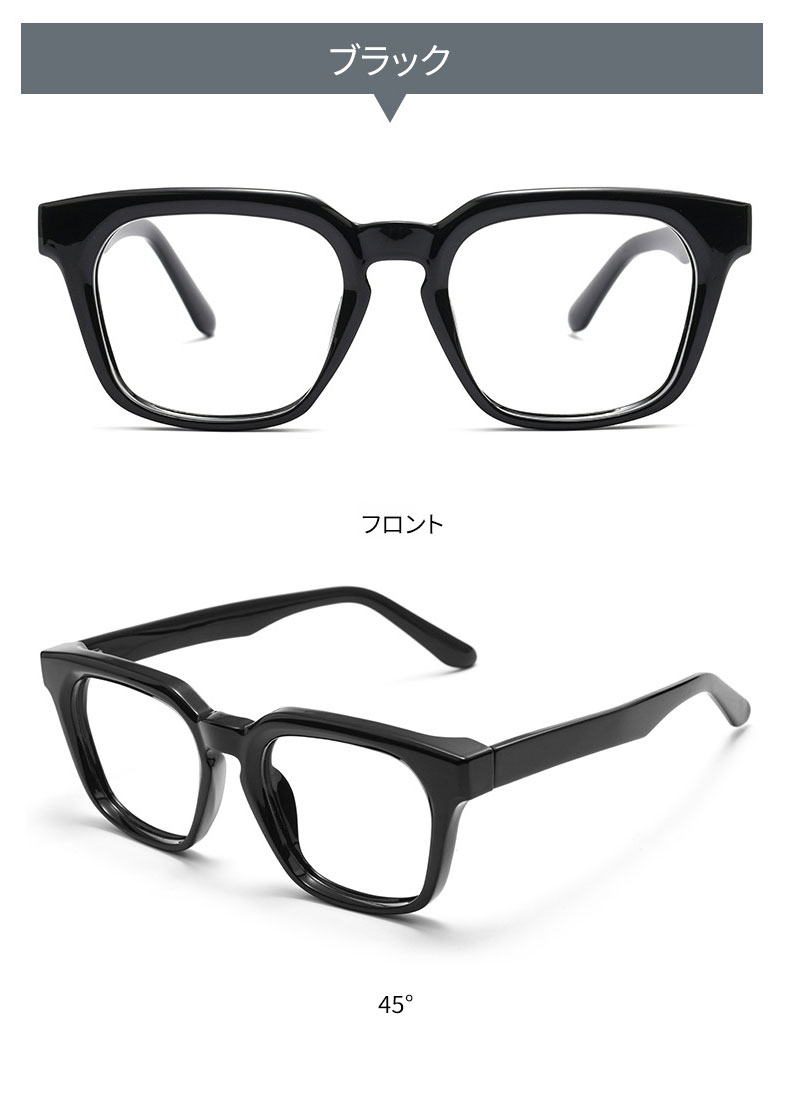 ミニマルな黒縁に大きめのスクエアフレームを組み合わせた、存在感のあるデザイン。艶やかなアセテートフロントが滑らかで深みのある質感を生み、人気の韓国風メガネらしい小顔効果のあるシルエットを演出します。