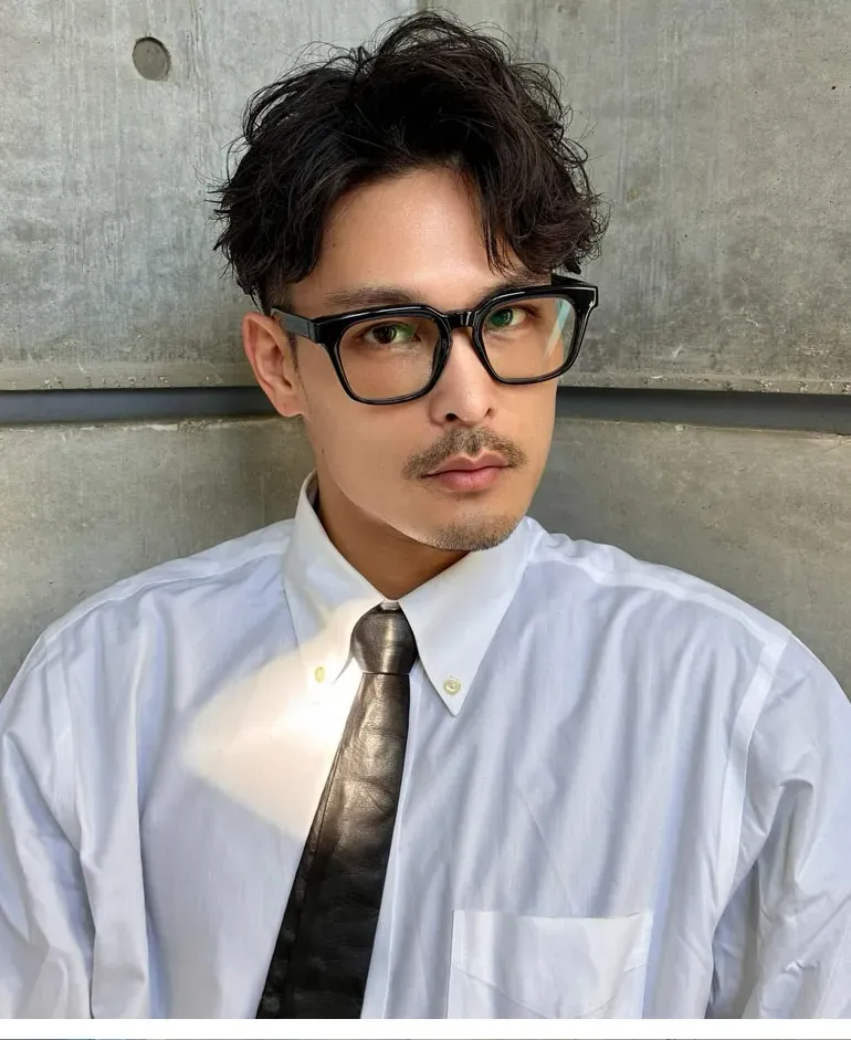 太めのブラックフレームが顔まわりを引き締め、シンプルなコーデにほどよいアクセントをプラス。ビジネスにもカジュアルにも相性がよく、1本あるだけで都会的なムードを演出できる万能フレームです。