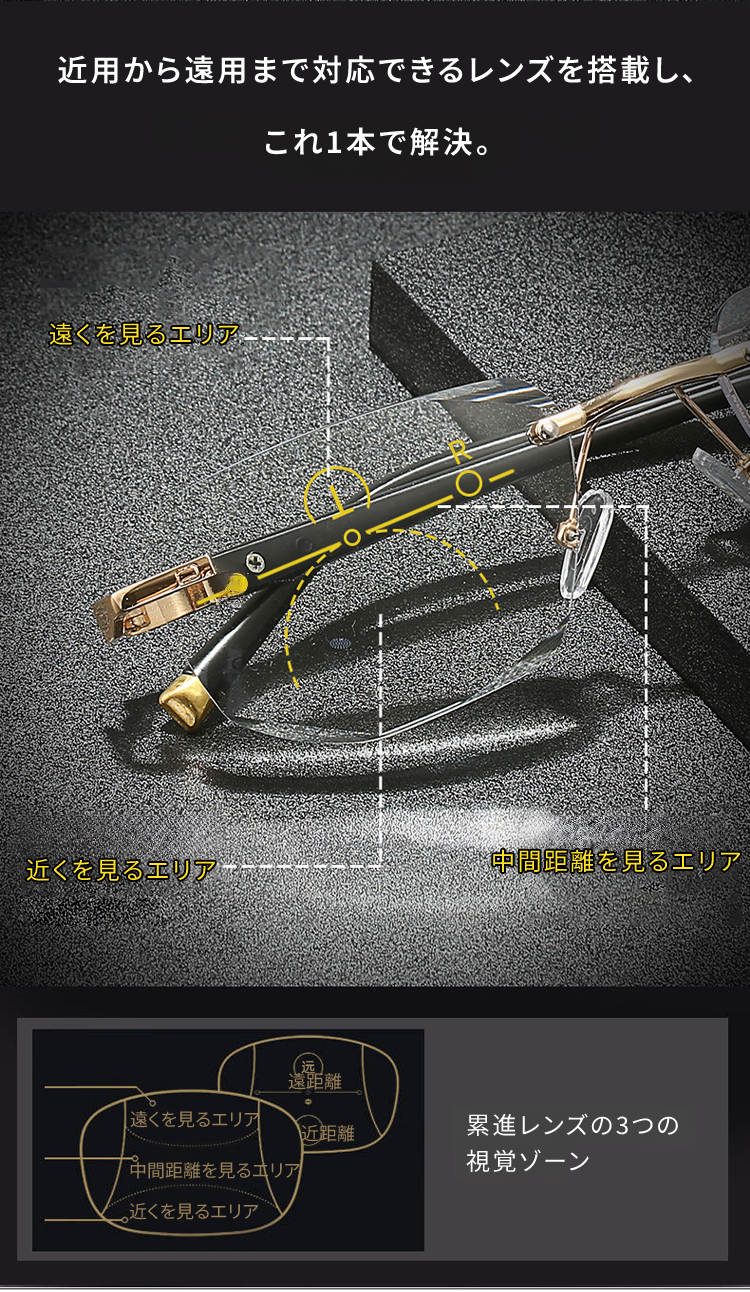 光環境や天候に応じて自動で色調を変える調光レンズを採用し、常に目を優しく守ります。遠近両用の多焦点機能により、読書から遠くを見る際の切り替えもスムーズで快適。リムレスデザインと軽量フレームの組み合わせで、長時間の装用でも疲れにくい。ゴールドのフレームが上品でラグジュアリーな印象を与え、多角形デザインと調和して個性を際立たせます。