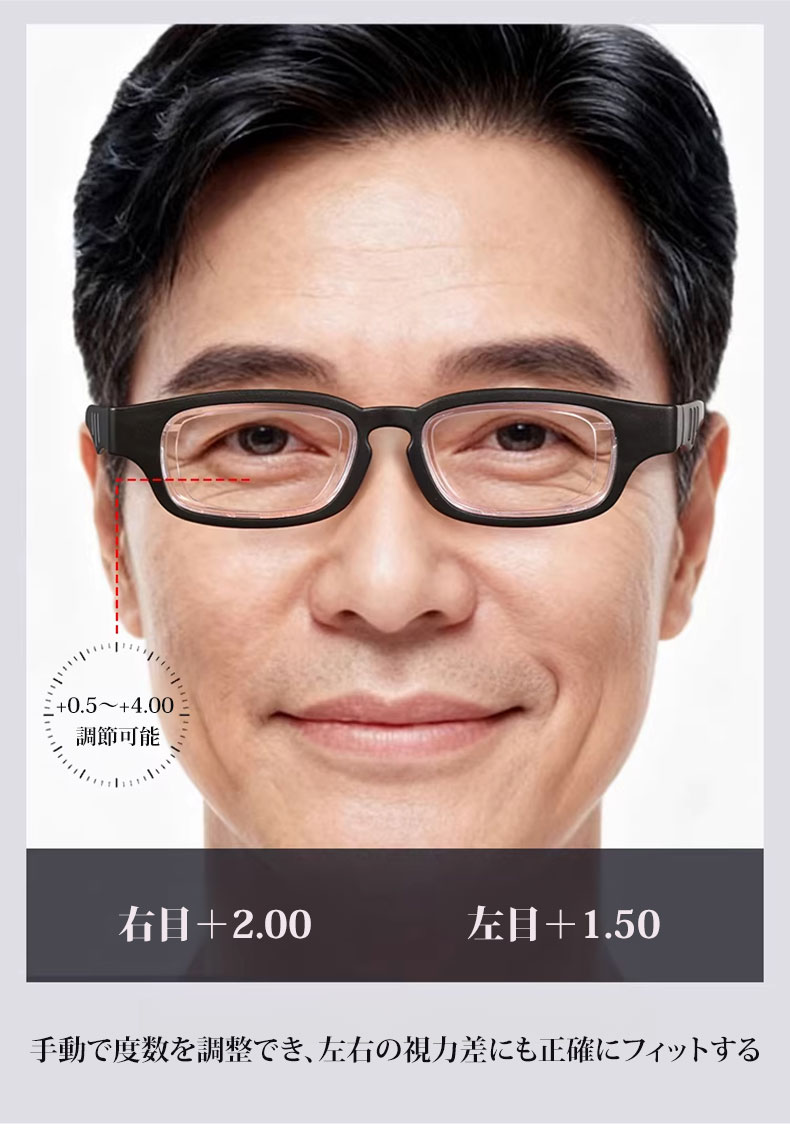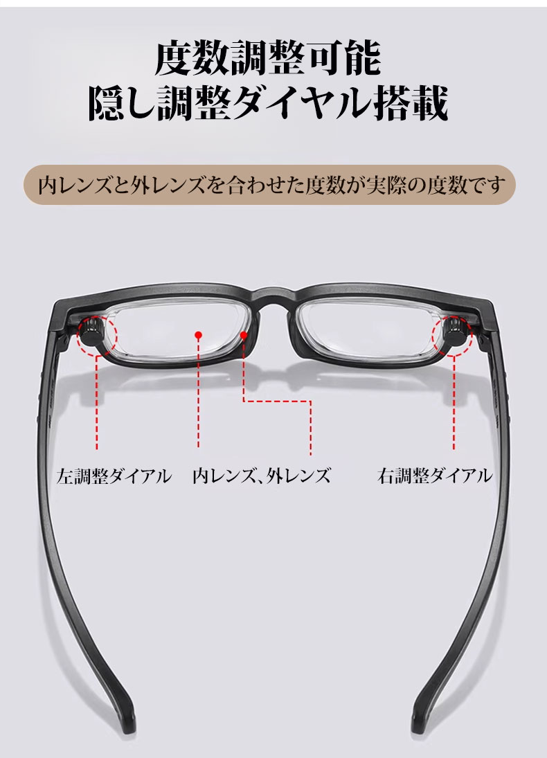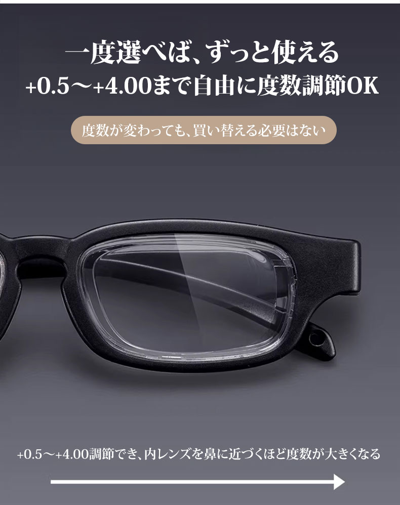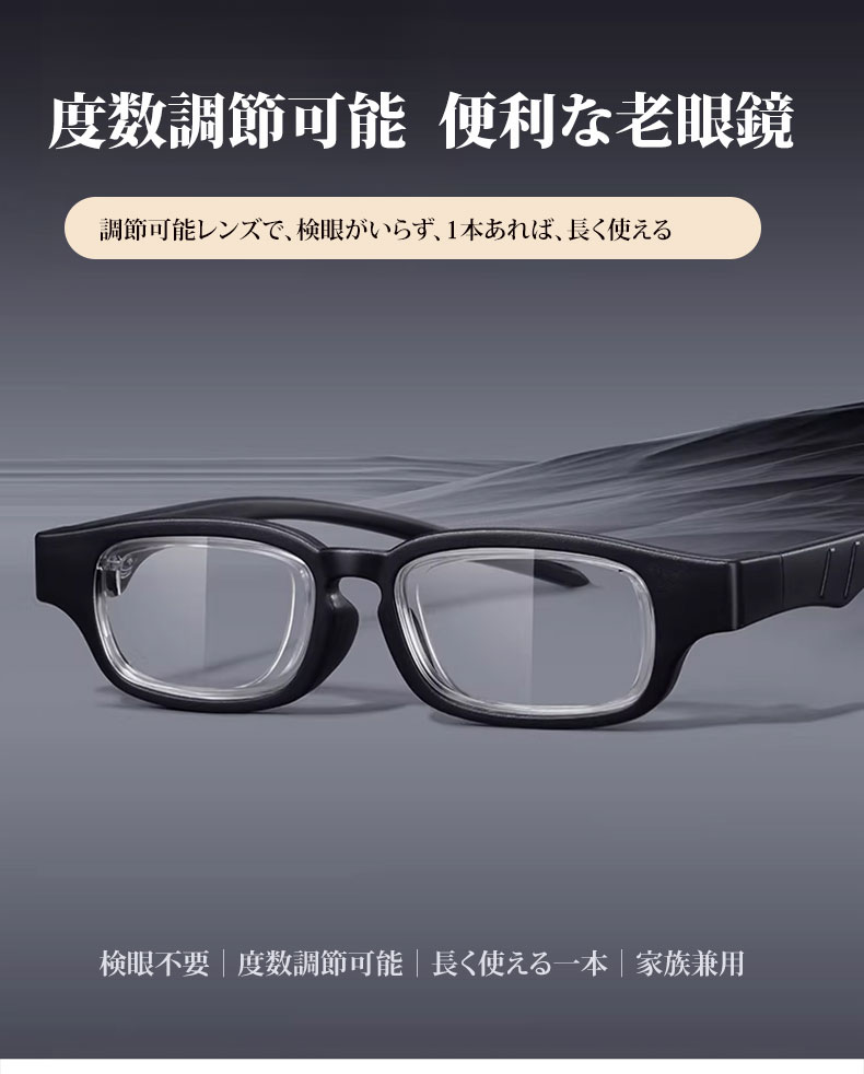【度数調節 +1.00〜+4.00・1本で解決】Eterlens 自動で度数が変えられる老眼鏡|超軽量TR素材|ブルーライトカット機能付き|黒縁スクエア型