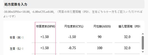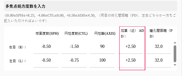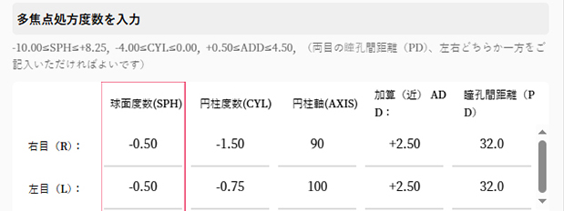 SPH处填写看远度数,ADD处填写看近度数 SPH欄には遠視度数を、ADD欄には近視度数をご記入ください。