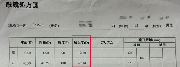 近方を見るための加入度数です。 加入度数はプラス(+)で表記されます。 数値が大きくなるほど加入度数が強くなります。