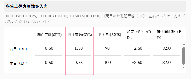 乱視の度合いを示しています。この数値が大きくなるほど乱視の度数が強くなります。