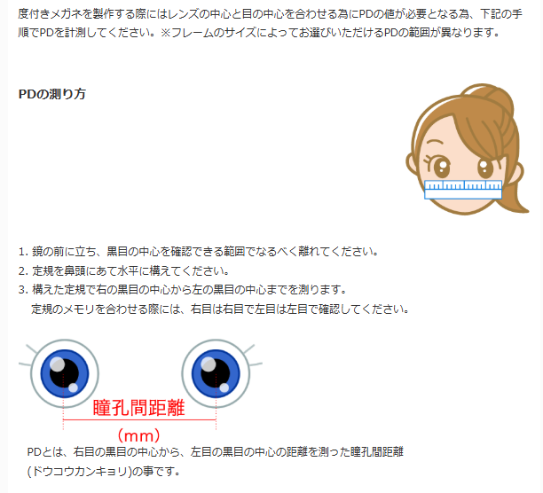 瞳孔間距離(mm) PDとは、右目の黒目の中心から、左目の黒目の中心の距離を測った瞳孔間距離(ドウコウカンキョリ)の事です。