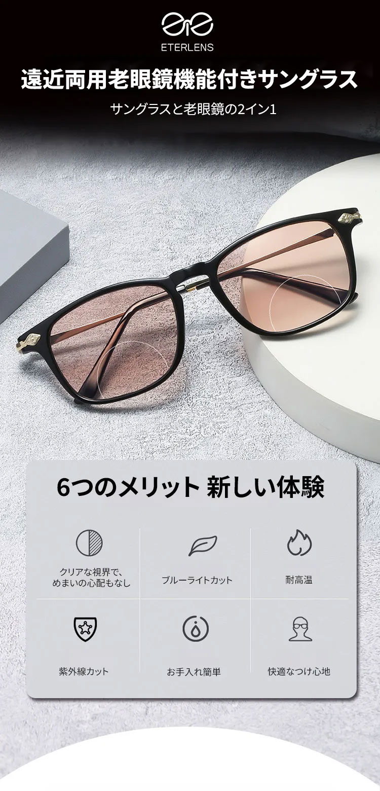 Eterlens 老眼鏡 \"デュアル・スタイル\" | 1つのレンズで2つの機能を持つ遠近両用サングラス | UVカット ウェリントン 黒金デザイン おしゃれ