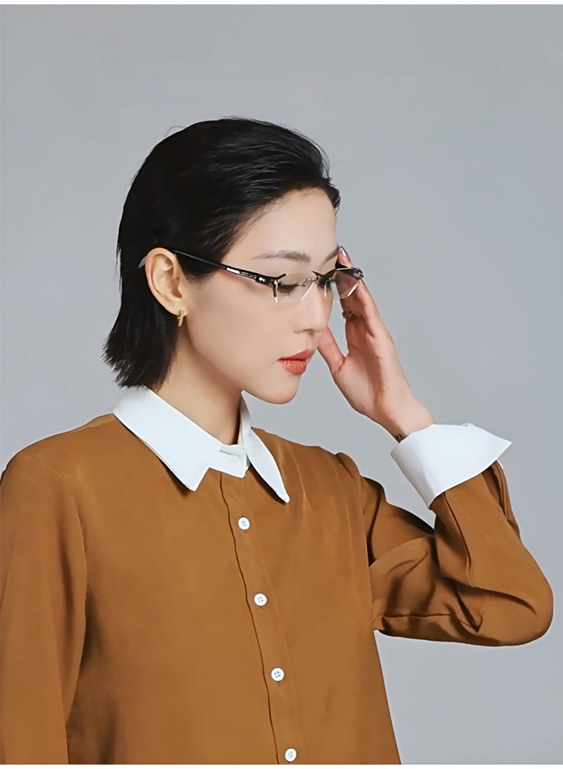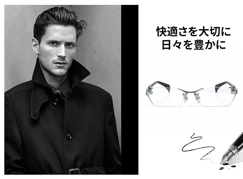 クラシックな構造にモダンなリムレスデザインを融合させた一本。シャープなラインが知的で洗練された印象を与え、ハーフリムの軽やかなフォルムが顔立ちを引き締めて、上品で知的な雰囲気を演出します。