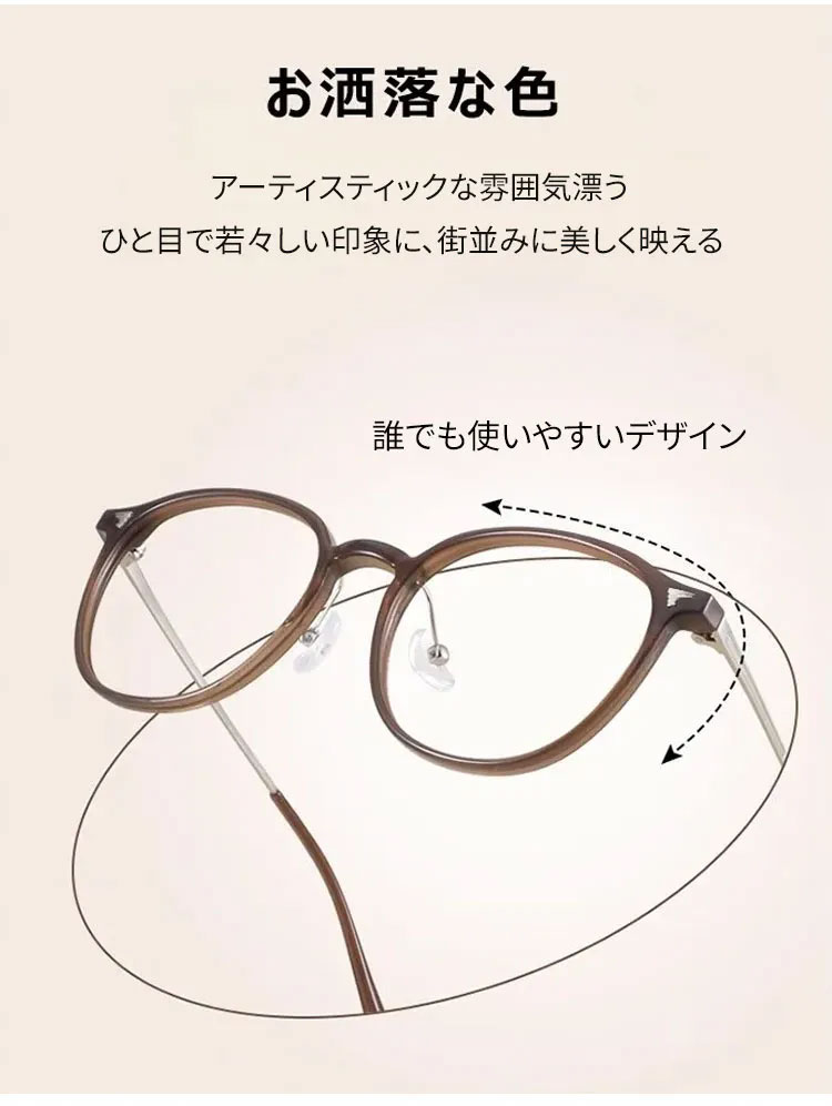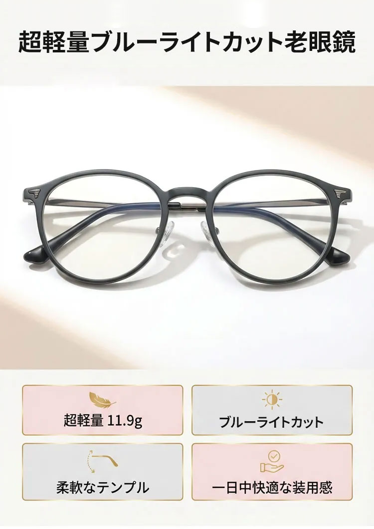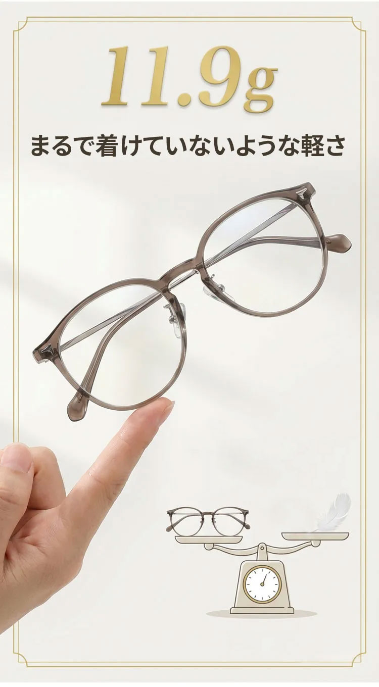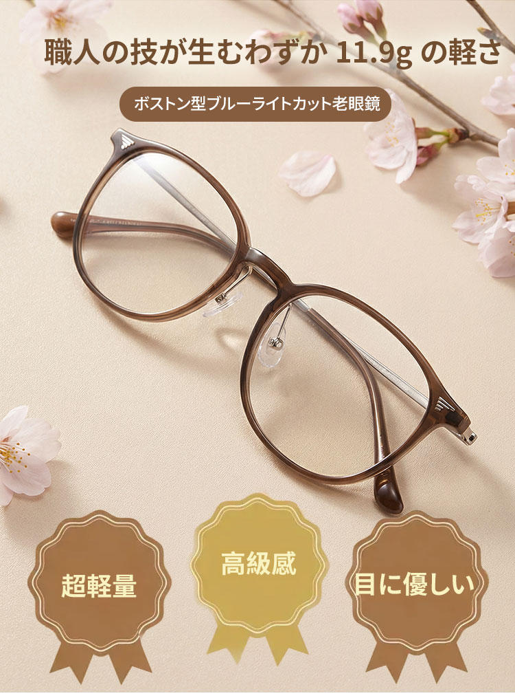 11.9g軽量の老眼鏡|透明感ブラウンのラウンド風フレーム|ブルーライトカット|Eterlens