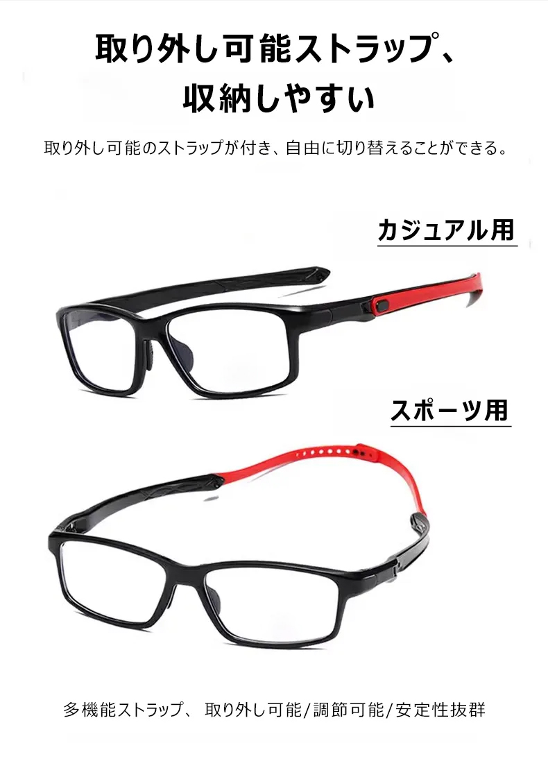 軽量で柔軟性に優れたTR素材を採用し、長時間の装着でもズレにくく快適。ブルーライトカットとUV対策を同時に備え、遠くも近くもクリアな視界を実現します。