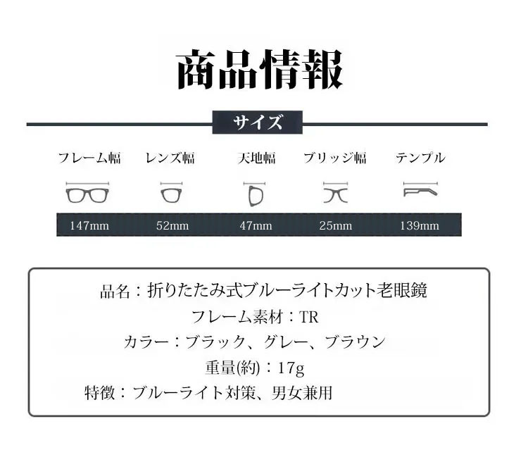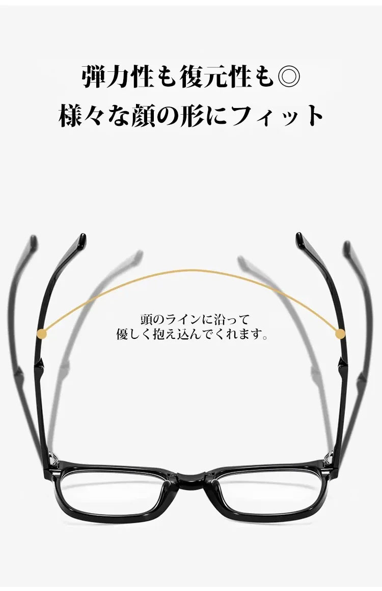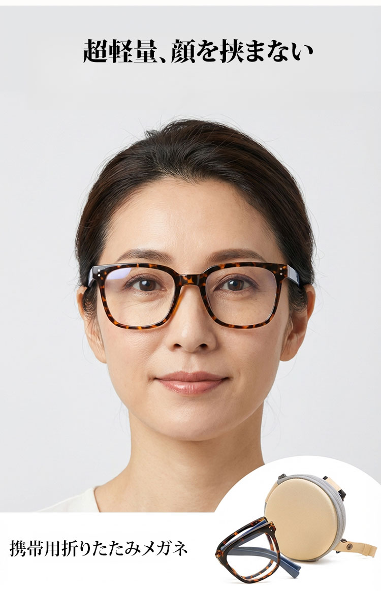 軽量で耐久性の高いTR素材を使用し、長時間の装着でも快適なフィット感を実現。レンズにはブルーライトカット機能を搭載し、デジタル環境にも対応。折りたたみデザインで持ち運びしやすく、収納ケース付きで外出時にも便利です。