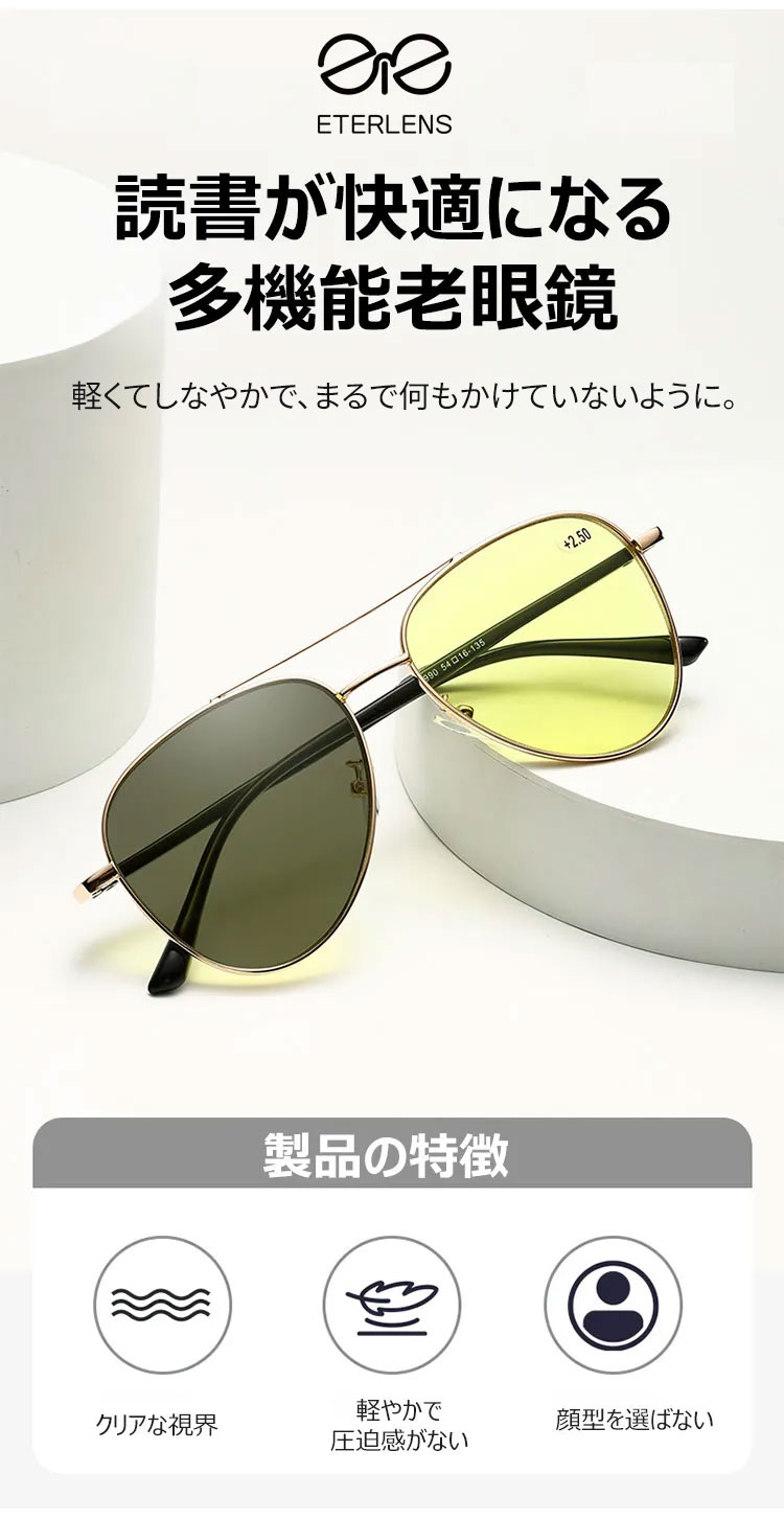 軽量なメタル素材を採用し、長時間の着用でも快適なフィット感をキープ。調光機能・ナイトビジョン機能・ブルーライトカット機能を備え、日常使いからドライブ、ナイトシーンまで幅広く活躍します。